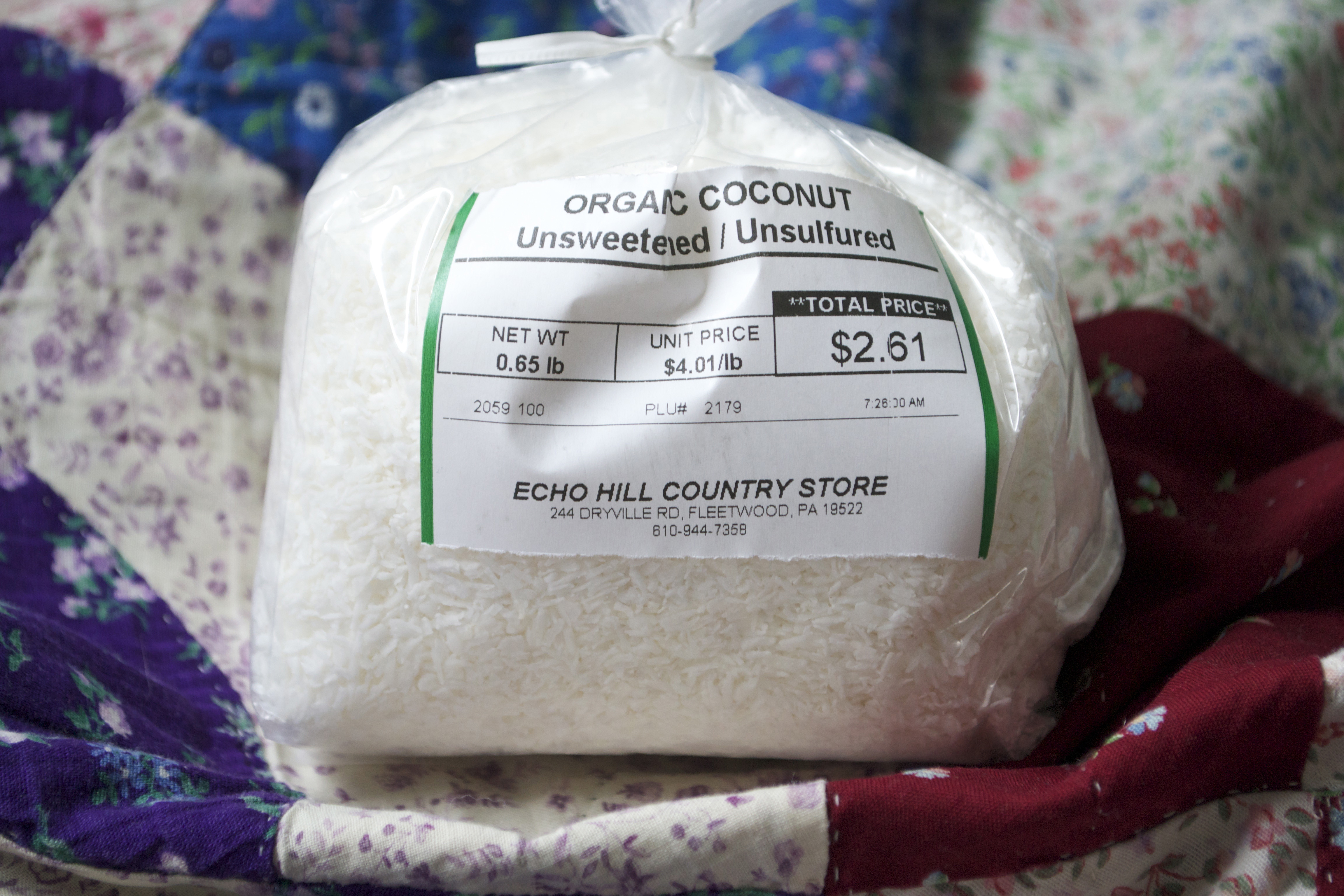 I used organic, unsweetened, unsulfured, shredded coconut. Shredded coconut is much smaller than the longer pieces that you usually see when you buy sweetened coconut & they’re crisper because they’re drier. Sweetened coconut is usually coated in corn syrup, which makes it sweeter, moister, plumper and ultimately less healthy. Combined with coconut oil & maple syrup, the crispy unsweetened flakes are the way to go.