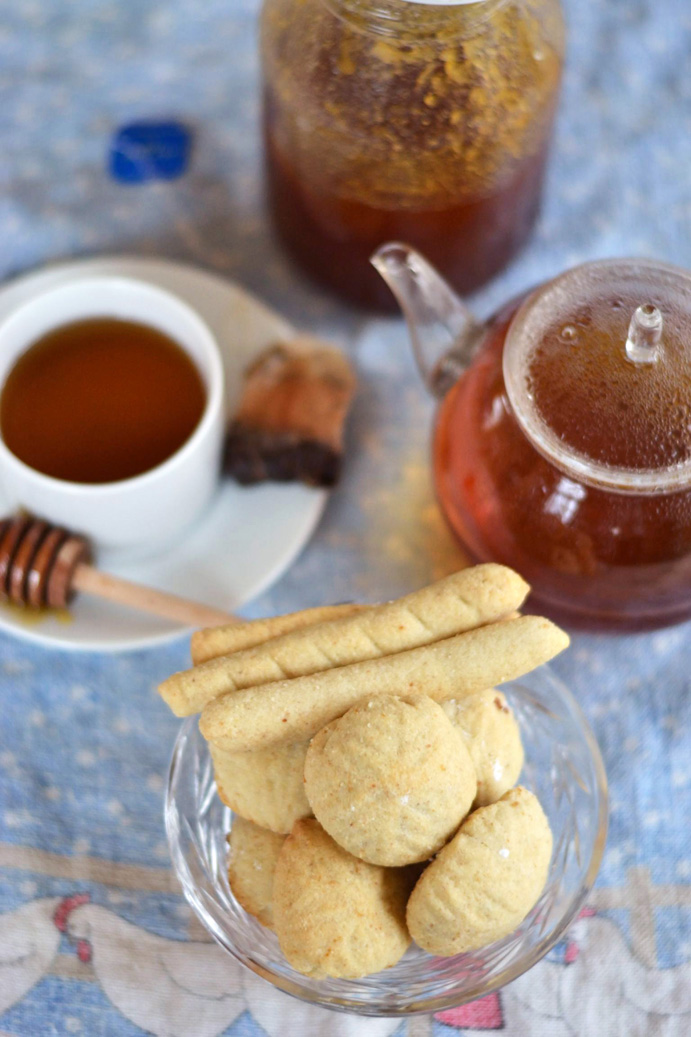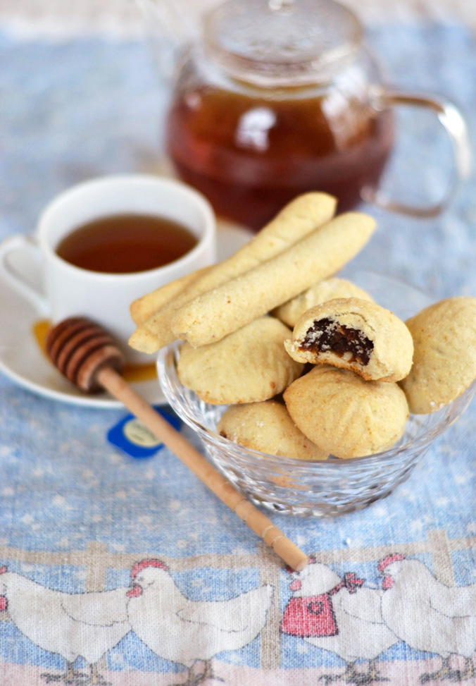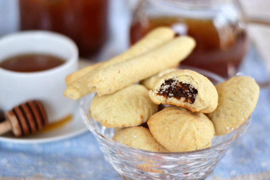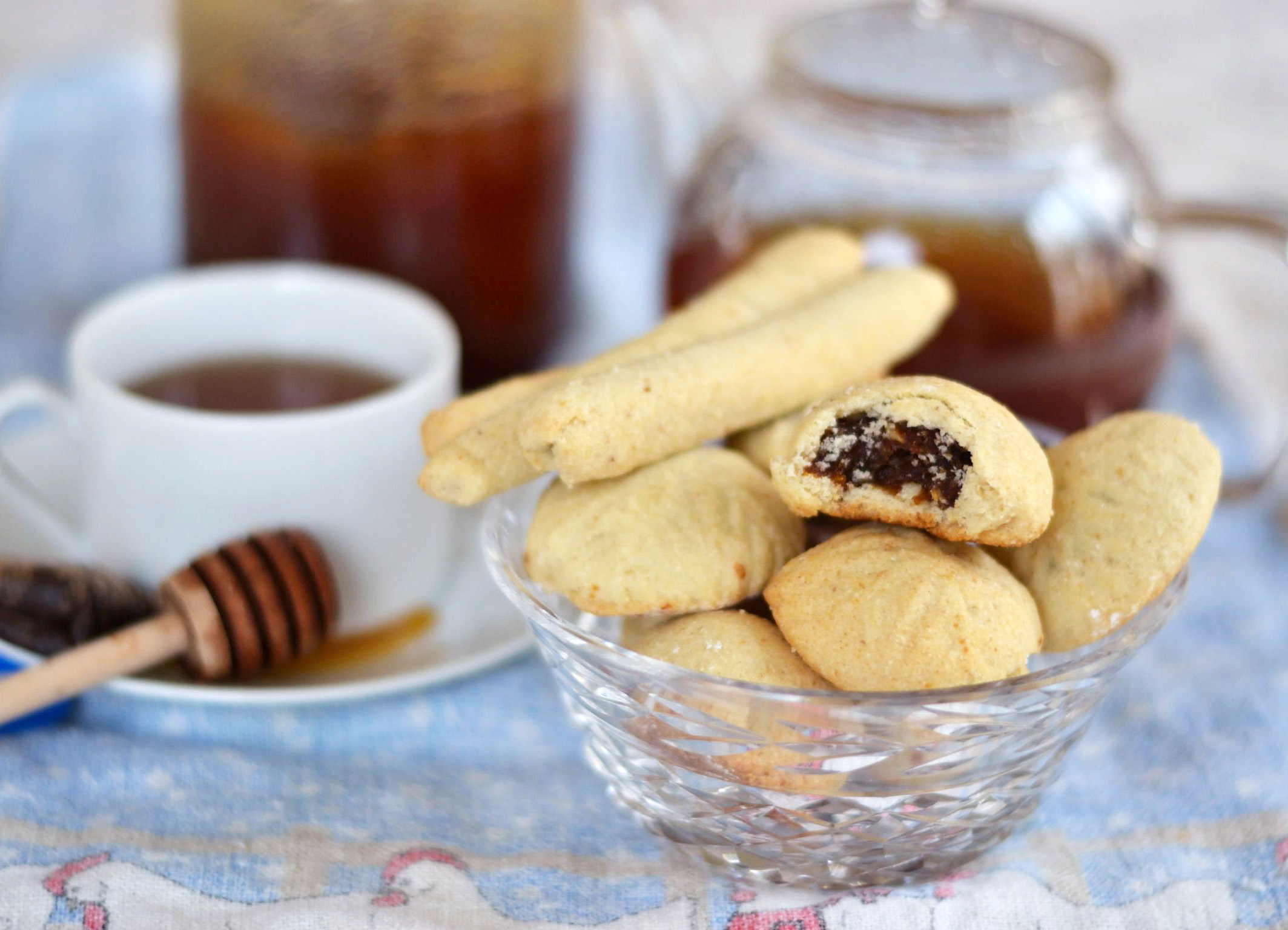 Spoon a walnut sized ball of dough into your hand. Using your thumb create a hole in the center and fill with a teaspoon of date filling. Close carefully, forming a sphere. They can also be made in a cigar shape by forming a flattened rectangle of dough, filling it with a thin, rolled out piece of date and then closing the dough around the date filling (Next time I’ll add photos).